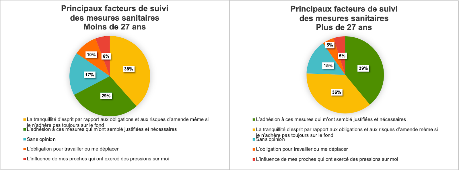 Les plus de 27 ans (âge médian) se démarquent légèrement de ce classement. Pour cette tranche d’âge, la raison première de suivre la plupart des mesures sanitaires est l’adhésion à ces mesures. Tandis que les moins de 27 ans semblent plus sensibles aux sanctions encourues en cas de non-respect.